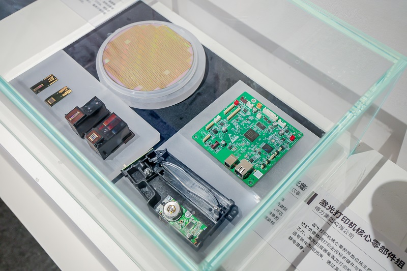 得力这次在国博的展出产品,是打印机和它的“心脏”。其中包括激光打印机组件,十大核心元器件已全面实现国产化,有激光扫描器、主控板(龙芯2P0500)等,目前得力的激光打印机已经实现了从主控芯片到激光扫描器,从固件到驱动的全栈自研。喷墨打印机组件则包括有晶圆、喷头芯片、喷头等。