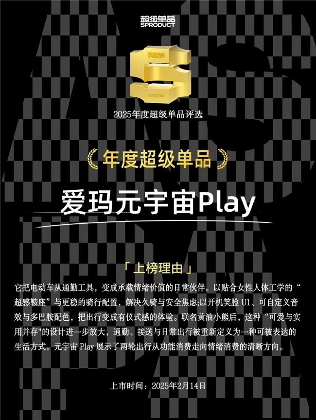 2026年2月9日,消费领域权威自媒体“超级单品 SP”揭晓的“2025年度超级单品”评选结果,为两轮出行行业写下了浓墨重彩的一笔。爱玛元宇宙Play电动车凭借全方位的产品实力,不负市场与用户的期待,成功斩获“年度超级单品”殊荣;其衍生款爱玛元宇宙Play黄油小熊版同步发力,获评“年度联名产品”。双奖加身的背后,不仅是爱玛对产品力的极致追求,更标志着两轮出行行业正式从功能消费向情绪消费跨越,开启了出行场景的全新叙事方式。