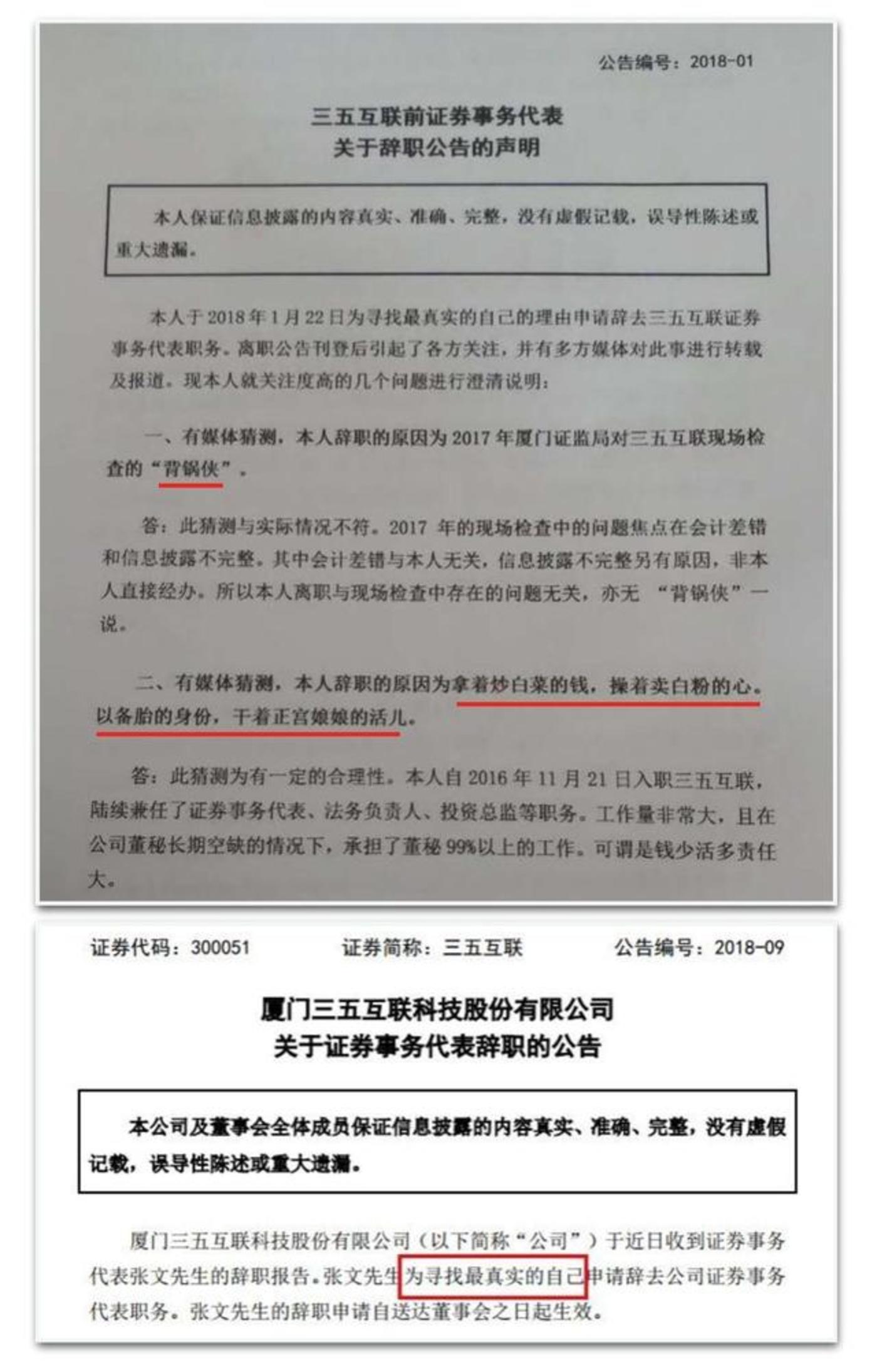 有意思的是,这不是三五互联第一次出现高管离职的神操作了,早在2018年,其证代张文就以“寻找最真实的自己”为由辞职,并称自己“拿着炒白菜的钱,操着卖白粉的心”。