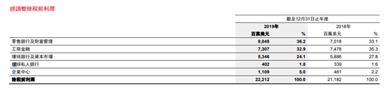 值得关注的是,汇丰的工商金融业务和零售银行及财富管理业务在2019年产生了较大坏账,导致其2019年经调整预期信贷损失及其他信贷减值准备为28亿美元,上升11亿美元。