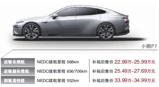 北京商报记者了解到,小鹏P7共推出后驱长续航、后驱超长续航以及四驱高性能3个系列车型,直接对标特斯拉国产的3款配置车型。其中,后驱超长续航车型提供3款配置,NEDC续航里程为706公里和656公里,超过国产长续航版Model 3的668公里。
