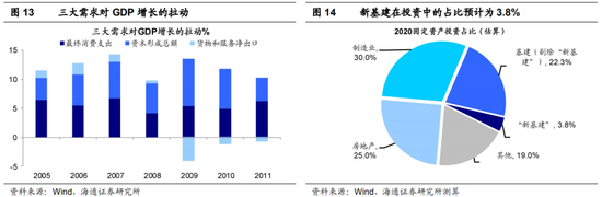 行稳致远,步步为营。目前海外疫情形势严峻,对我国外需的影响是必然的。参考08年金融危机大跌后,09年数据显示缺失的外需只能由内需来补。在政策不断加码内需后,当年与4万亿基建相关的水泥制造、工程机械等行业,和消费补贴相关的汽车、家电等行业,以及政策放松的房地产行业在09年2季度率先走出颓势,净利润增长由负转正。今年4月17日中共中央政治局会议召开也显示国内政策将继续加码内需方向,重点是新基建和消费,全国政协和人大会议将分别在5月21和22日召开,届时全年的经济目标将进一步明朗。对比09年,我们预计本次扩内需的相关行业利润回升或将更加明显。新基建方面,主要聚焦科技,在大方向上与我国产业结构向信息化调整的方向一致。从目前已披露投资规模的新基建项目来看:5G基建方面,20年三大运营商5G资本开支目标1803亿元、同比增长338%,5G基站建设目标50万个、同比增加285%。特高压方面,全年建设项目投资规模将达到1811亿元,同比增长200%左右。我们预计新基建其余领域将来也会陆续公布具体投资规模规划,参考目前已经披露的2个领域,投资规模增速较高。消费方面,我们预计这次特别国债更多是用于拉动内需消费、增加产业补贴,尤其是汽车、家电等。历史上特别国债发行规模一般占财政总收入的30%,去年国家财政收入在19万亿人民币左右,所以我们估算本次特别国债的发行规模至少在1万亿以上,预计5月份落地。目前拉动汽车消费的政策已出,4月29日国家发展改革委、科技部等11部门公布《关于稳定和扩大汽车消费若干措施的通知》,其余政策后期有望逐步落实并进一步加码,国内受疫情冲击延后的消费需求有望得到持续拉动,以家电、汽车为代表的可选消费将引来结构性机会。今年以来汽车、家电两个行业累计涨跌幅分别为-4.5%和-5.2%,处于行业涨幅排序中下水平。从20Q1基金季报中看,基金重仓股中汽车股市值占比为2%,创近十年新低,家电占比为4.1%,创17年以来新低。看得再长远一点,3浪期间行业表现分化源自利润增速分化,符合时代背景特征的主导产业盈利更好。新时代产业方向是信息化服务化,科技+券商将是这次牛市的主导产业。