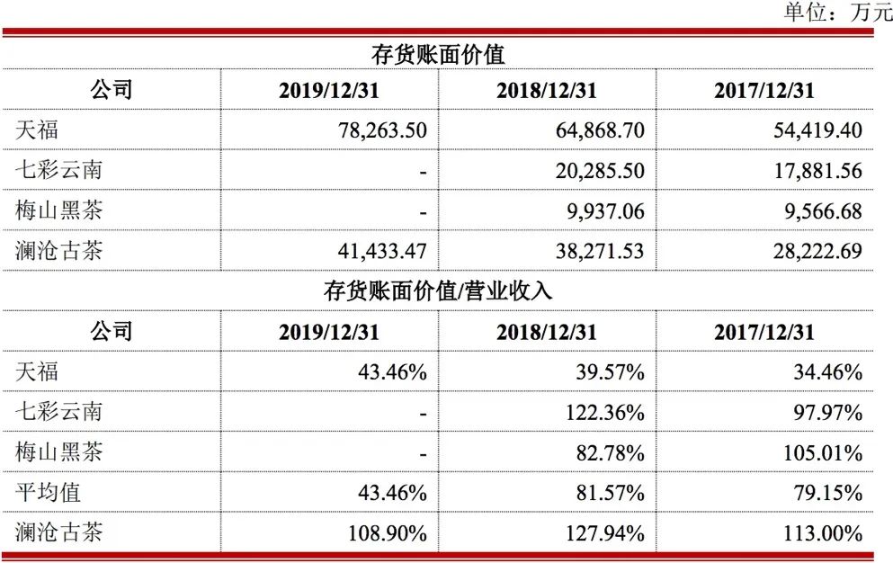 然而,《投资时报》研究员注意到,澜沧古茶持续攀升的存货余额并非全因行业市场规模小所致。横向对比其同行业公司可以看到,报告期内,天福、七彩云南和梅山黑茶的存货与营业收入比例的均值仅为79.15%、81.57%和43.46%,远低于澜沧古茶的113.00%、127.94%和108.90%。