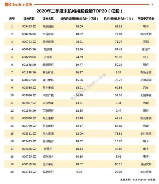 事实上,近几年抱团核心资产已经成为机构的共识。东方财富网Choice数据显示,从最新的机构持股情况来看,2020年二季度末,机构持有海康威视股数最多,达到了56.09亿股,持股比例达到了68.32%。作为医药行业热门个股的恒瑞医药,其机构持流通股数总和也达到了40.82亿股,持股比例达到77.09%。