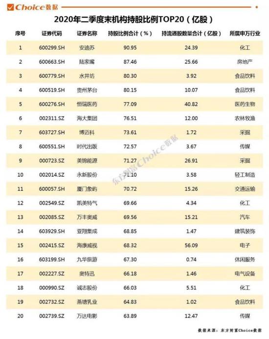 从所有机构持股比例合计来看,2020年二季度末,安迪苏机构持股比例最高,达到90.95%。陆家嘴、水井坊、贵州茅台机构持股比例超80%,分别为87.46%、80.30%、80.15%。恒瑞医药、海大集团、博迈科、时代出版、永新股份和厦门象屿机构持股比例超70%。