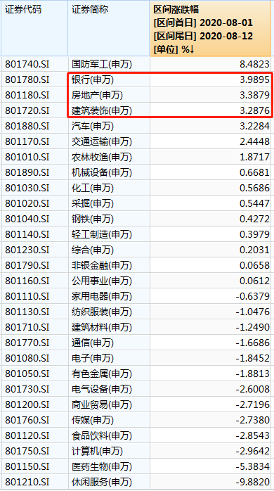 值得注意的是,在生物医药等热门板块回调的过程中,银行、房地产、建筑装饰等低估值板块有所表现,其中银行板块表现相对突出。