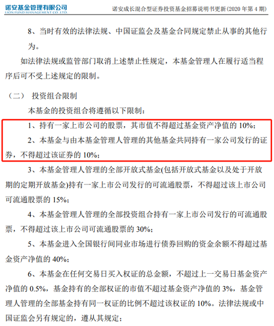 以诺安成长为例,其招募说明书显示,本基金投资组合持有一家上市公司的股票,市值不得超过基金资产净值的10%;本基金与由本基金管理人管理的其他基金共同持有一家公司发行的证券,不得超过该证券的10%。