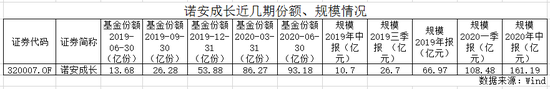 规模方面,据Wind资讯数据,诺安成长从2019年6月末的10.7亿元,之后迅速飙升,截至2020年一季度末,诺安成长资产净值突破百亿,达到108.48亿元。截至2020年6月末,该产品规模又增加至161.19亿元。与此同时,份额也从2019年6月末的13.68亿份上涨至2020年6月末的93.18亿份,增长近6倍。