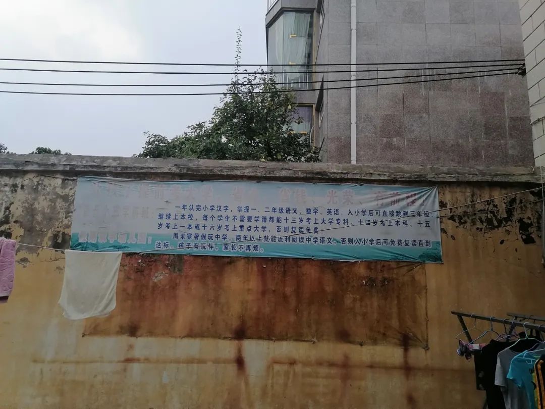 “圣童家学”的院墙上有一幅广告:“十六岁考上重点本科,否则复读免费”。看上去张挂了很久。