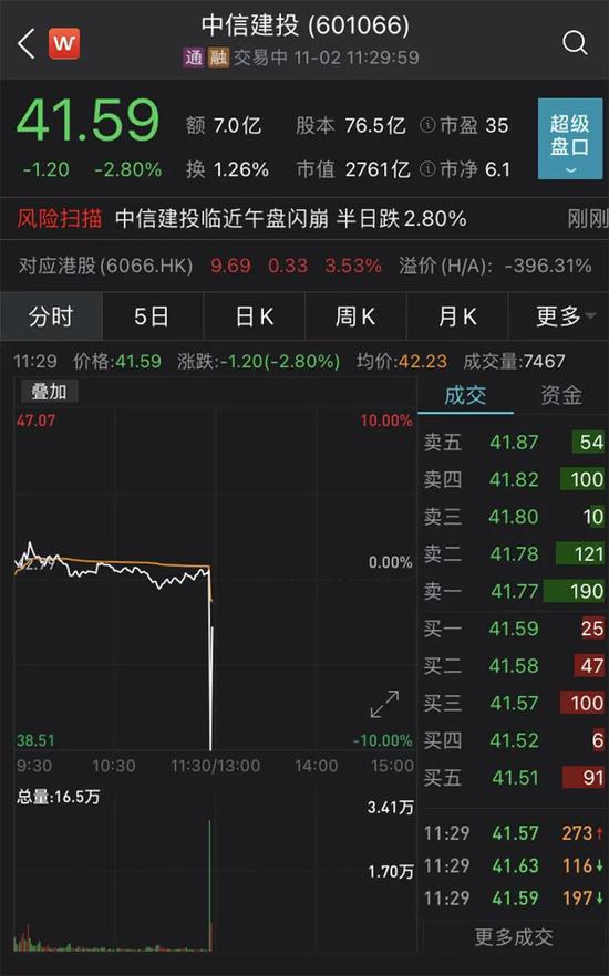 高频数据显示,中信建投在11时28分32秒出现一笔约9500手的大单成交,将实时股价从43.04元/股瞬间打压至跌停价38.51元/股。对此,公司方面回应一切正常。