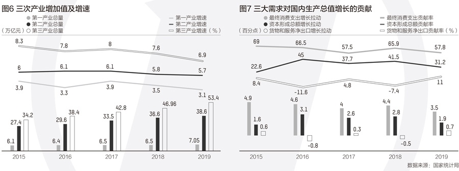 2019年,三次产业增加值占GDP的比重分别为7.1%、39%和53.9%,与上年相比,第一产业比重提高0.1个百分点,第二产业比重下降0.7个百分点,第三产业比重提高0.6个百分点,经济结构持续优化。