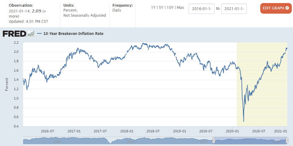 美债收益率走高背后的通胀风险也在显现,这对美联储的政策预期造成扰动。本周10年期美债盈亏平衡利率突破2%,创2018年10月以来新高,触及美联储设定的关键通胀目标,或影响未来货币政策收紧节奏。Capitol Securities Management首席策略师恩格尔克(Kent Engelke)指出,除了去年3月,2009年以来的每一次美股大规模抛售,都与10年期美债盈亏平衡利率大幅上升有关。