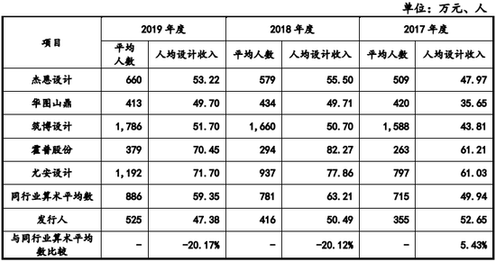 据招股书数据显示,2017年—2019年该公司平均人数分别为355人、416人及525人,同期人均设计收入分别为52.65万元、50.49万元及47.38万元。值得注意的是,该指标不仅逐年下滑,且在2018年及2019年还远低于可比公司均值。