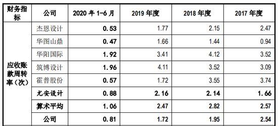 徐辉设计在问询回复函中表示,报告期内公司应收账款周转率低于可比公司的平均值,但与杰恩设计、华图山鼎和尤安设计的应收账款周转率及波动趋势较为接近。至于直接原因,该公司并未给出具体回复。