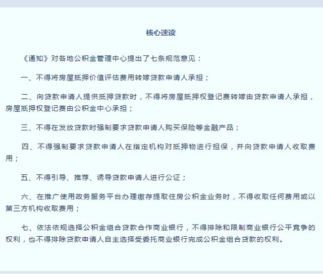 《通知》对各地公积金管理中心提出了七条规范意见:一是不得将房屋抵押价值评估费用转嫁贷款申请人承担;二是向贷款申请人提供抵押贷款时,不得将房屋抵押权登记费转嫁由贷款申请人承担,房屋抵押权登记费由公积金中心承担;三是不得在发放贷款时强制要求贷款申请人购买保险等金融产品;四是不得强制要求贷款申请人在指定机构对抵押物进行担保,并向贷款申请人收取费用;五是不得引导、推荐、诱导贷款申请人进行公证,变相地将自身的贷款审查审核职能交由公证机构来完成;六是在推广使用政务服务平台办理缴存提取住房公积金业务时,不得收取任何费用或以第三方机构收取费用;七是依法依规选择公积金组合贷款合作商业银行,不得排除和限制商业银行公平竞争的权利,也不得排除贷款申请人自主选择受委托商业银行完成公积金组合贷款的权利。