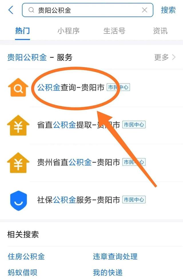 进入支付宝搜索栏直接搜索“贵阳公积金”,点击“公积金查询-贵阳市”选择“我的缴存”查询。