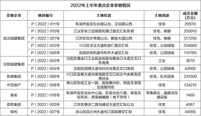 拿地企业方面,2022上半年土地市场的参与主体以本土国企为主,武汉城建拿地5宗、汉阳城建拿地2宗,另有凯德、保利、瑞安大型房企拿地。