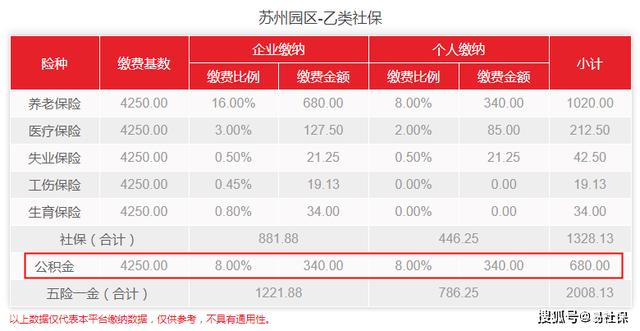 总结:如果按照最低社保缴纳基数计算的话,苏州园区最新五险一金费用是2008.13元,其中五险的费用是1328.13元,公积金的费用是公司和个人分别需要缴纳340元