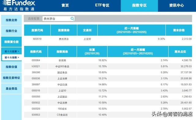 比如我输入网红股“贵州茅台”,发现了茅台权重最高的指数竟然是这10个指数,国证食品饮料指数里面茅台的权重甚至要高于中证白酒指数里面茅台的权重。