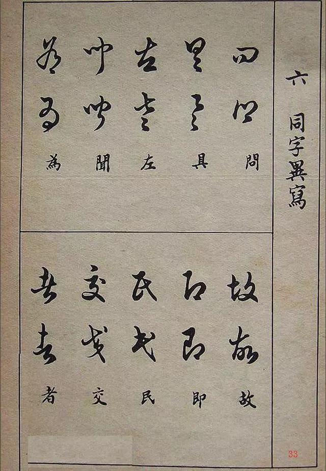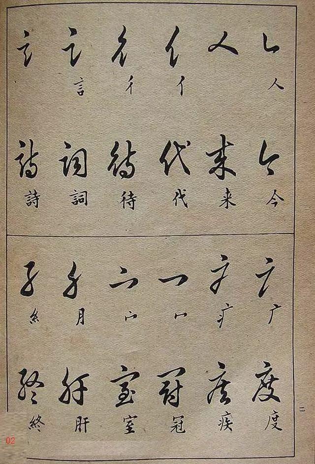 邓散木:草书的写法,一般要先从偏旁部首学习,记住常用偏旁与部首,然后分析在不同词语与句子中的运用。熟悉之后,再记住常用字及在不同地方的使用区别。这样,才能掌握草书的基本要素,直到熟中生巧,才有可能写好草书字体。