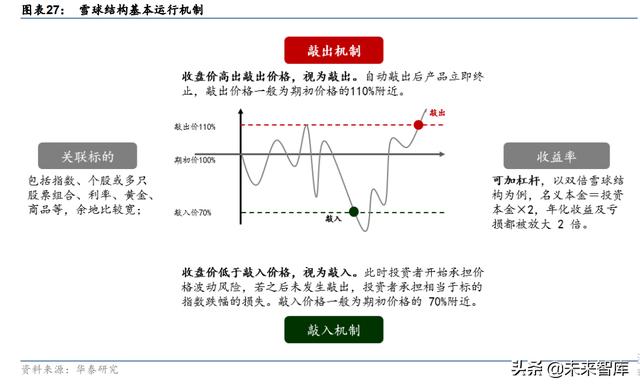 1)雪球的运行和对冲结构在一定程度上能够平抑市场波动。雪球结构本质上是投资者向券 商卖出带触发条件的看跌期权,设置有敲入、敲出条件,最后的收益取决于挂钩标的资产 的表现和敲入敲出事件是否发生。雪球产品伴随财富管理需求产生和壮大,满足近两年来 低利率和资本市场高波动环境下,投资者对稳健配置权益市场和管理价格波动风险的需求。 根据证券业协会和中证报价的统计,截至 2022 年 2 月末,雪球产品存续规模约为 1500 亿 元,主要集中在股票指数。雪球产品的运行和对冲结构,决定其在一定程度上能够平抑市 场波动,但若市场下行幅度达到集中敲入线,会因对冲持仓减少对市场产生一定影响,但 由于敲入线较为分散、产品规模较小、对冲多以股指期货为主,因此对股票市场直接影响 较小。而对于券商来说,有效的对冲能够使得其规避亏损,并且伴随市场波动持续进行对 冲仓位调节,还将扩大券商的盈利水平。