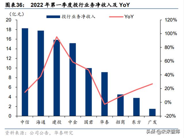2)22Q1 变化:市场波动下投资收入大幅下降拖累业绩。除投行业务外,四大业务条线收 入均有所下降,其中投资业务受市场波动影响下降幅度较大,2022 年一季度实现净收入 34 元,同比-85%,占营业收入比例 6%(21 一季度为 28%);利息净收入 69 亿元,同比-9%; 资管净收入 84 亿元,同比-7%;经纪净收入 167 亿元,同比-3%;注册制改革深化背景下, 投行业务收入保持增长态势,2022 年一季度投行净收入 96 亿元,同比 35%。其他业务实 现净收入 159 亿元(主要为期货子公司大宗商品贸易收入,实际利润率低),同比-6%。