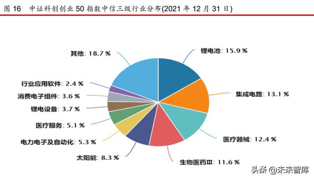 2021 年 5 月 10 日,中证指数公司发布了中证科创创业 50 指数,从科创板和创业板中选 取市值较大的 50 只新兴产业上市公司证券作为指数样本。从中信三级行业分布上看,截至 2021 年 12 月 31 日,新能源动力系统、半导体、生物医药是权重最高的三个板块。