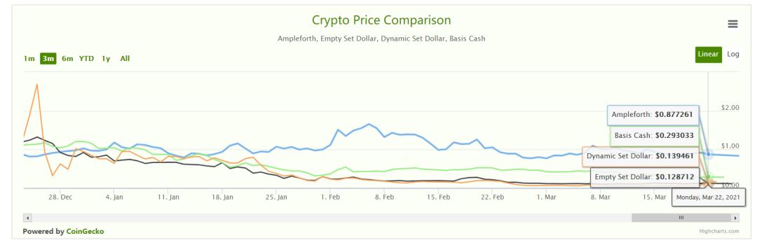 作为当前以太坊市值(3亿美元)最高的算法稳定币,AMPL从2月22日至今已经通缩了30多天。这意味着持币者要承担币价下跌和币被扣除的双重损失。