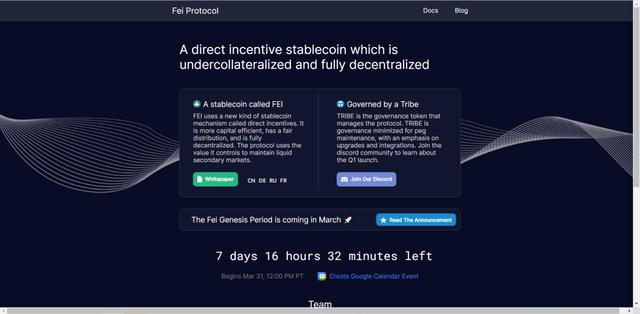 Fei创新性提出了“流动性作为抵押品”的概念。Fei的初始代币分发是通过以ETH计价的联合曲线来购买,Fei项目方把这些通过购买进来的ETH定义为协议控制资产价值Protocol Controlled Value (PCV)。FEI协议创世时将用PCV全部资产为Uniswap上的ETH/FEI提供流动性,这是一种不需要超额抵押的“流动性担保”模型。随着供应的增长,联合曲线的代币价格接近预言机的固定价格,当Uniswap价格高于锚定价时可确保产生套利机会,而如果Uniswap价格低于锚定价一段时间则PCV可以提供流动性来支撑其回到锚定价。当Fei价格低于1美元,Fei首先采取的措施是惩罚卖家奖赏买家,卖出Fei的用户将有4%的额外损失,买入的用户将额外获得2%的奖励。如果还不能阻止价格下跌,Fei会动用抵押品在市场上购买Fei。Fei原计划于3月23日开启为期 3 日的创世期启动,后延期至3月31日启动。目前Fei已经获得1900万美元融资,投资方包括A16Z、 Coinbase Ventures 、Framework等。