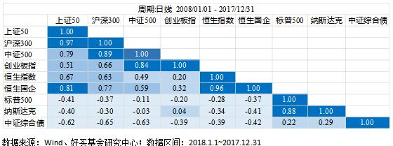 研究发现:组合内不同资产类别的相关性越低,整体风险越分散,收益也更稳健。我们对市场上各类资产进行筛选,选取近10年的数据,做相关性分析。发现:股票和债券呈负相关,A股和海外股市的相关性也较低(尤其美股)。因此,可以通过构建不同资产的组合对冲风险。