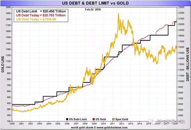 不过,刚才说了,美元主要是采用国债作抵押来印刷,所以我们可以通过观察美国政府债务与黄金价格的关系来发现这种一致性。