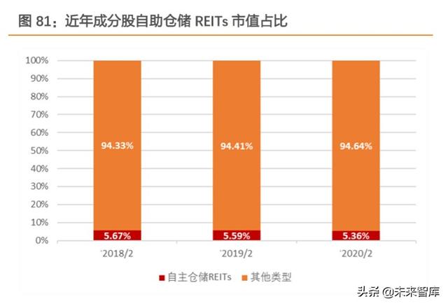 截止 2020 年 2 月,在 NAREIT 成分股的 5 个自助仓储 REITs 中,有一家公司市值超过 200 亿元,为 Public Storage,分别为 365 亿美元。