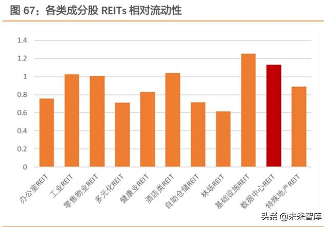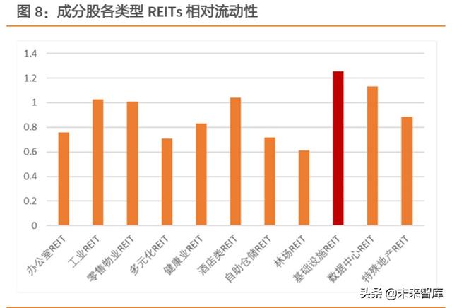 基础设施类 REITs 流动性良好。根据 NAREIT 数据库,成分股中基础设施 REITs 平均每个 REIT 每日成交量为 145 万股,在各类型 REITs 中排名靠前,而基础设施 REITs 相对流动性 为 1.253,为各类型第一。总体来说基础设施 REITs 流动性风险相对较小。