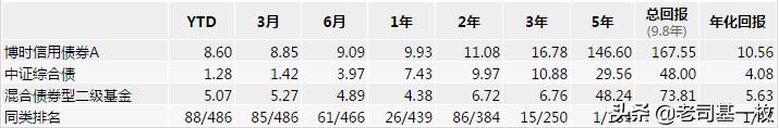博时是业界固收大拿,债券基金数量比权益类基金还要多,债基总规模超过1700亿元。要知道,40多家基金公司总规模还徘徊在100亿元以下,只有21家基金公司总规模超过博时债基规模。要在89只选出一只牛基,还真不是件容易的事情,博时信用债就是那颗最闪亮的明星。该基金成立于2009年6月,成立至今总回报为167.55%,年化回报高达10.56%,在同类基金中位居第一!他家还有不少的债券牛基,如博时双月薪,成立5年多时间,年化回报为9.11%;博时天颐A,成立7年多时间,年化回报为6.82%。