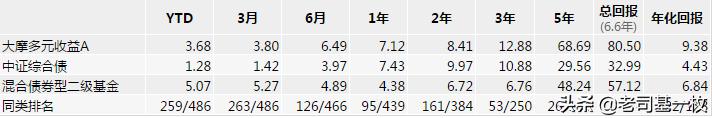 大摩多元收益A是大摩华鑫旗下成立的第二只债券基金,成立于2012年8月,成立6多年来,总回报达到80.5%,年化回报为9.38%。另外,大摩旗下第一只债券基金大摩强收益债券成立于2009年底,成立9年多时间,年化回报为7.02%;大摩纯债稳定增利表现也不错,成立近6年时间,总回报为59.84%,年化回报为8.51%,在同期108只同类中长期纯债基金中高居第一。