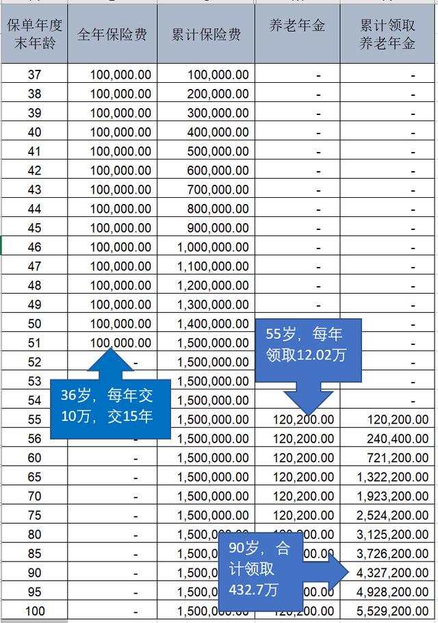 来晒一下我的保单内容吧:年交10万,交15年。55岁开始,每年领12.02万(如果月领,每月领10097),保证最少领取20年,活多久领多久,我要是活个100岁,可以领到553万。(好吧,为了多领点钱,我要努力活久一点……)