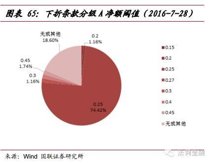 从分级基金条款来看,不定期折算方面,多数分级基金上折条款中母基金净额阈值为 1.5,即当母基金净值达到 1.5 时,净值归 1 、新增份额折算成母基金场内份额、子基金份额不变(或净值不变、子基金份额不变);下折条款中分级 A 净额阈值多为0.25,即当 A 级净值达到 0.25 时,净值归 1 、新增份额折算成母基金场内份额、与A 级保持份额比例不变。定期折算方面,周期多为一年。