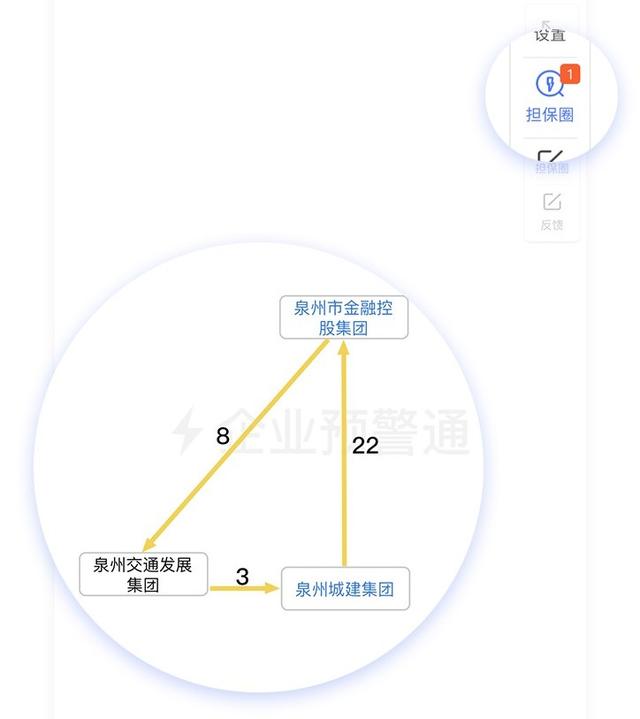 通过右侧的「担保圈」,可以看到在上面复杂的担保链路中,“泉州市金融控股集团”、“泉州市城建”和“泉州交通发展集团”3家企业间形成了关系非常紧密的担保闭环。