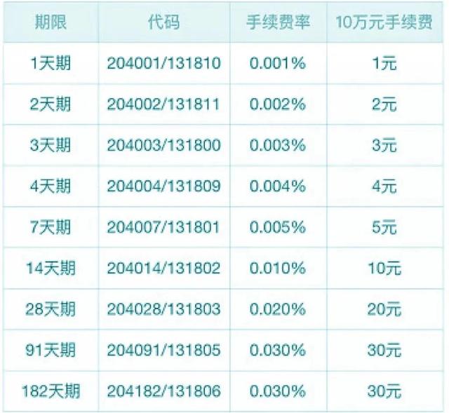 在这里,我也为你整理了一份不同期限的国债逆回购对应的手续费,供你参考。