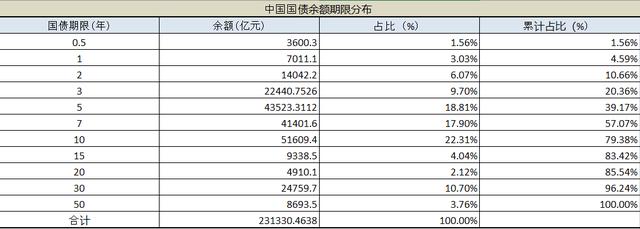 根据WIND提供的数据,统计得出各期限的中国国债发行量及所占比例如下。其中,1年期及以下占26.65%,2-10年期占63.32%,10年期以上占10.03%。
