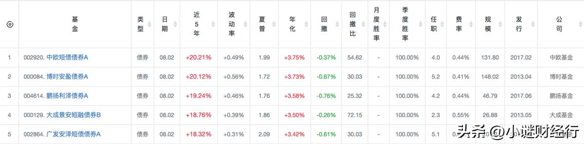 筛选条件四:中短债、上市至少三年、最大回撤小于2%、规模大于2亿。选出前五家公司