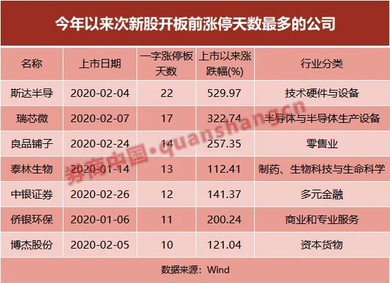上市后涨停板数量有两位数的仅有7家,占比19%,集中在1-2月。比如斯达半岛开板前有22个涨停,数量最多;瑞芯微17个涨停;良品铺子14个。