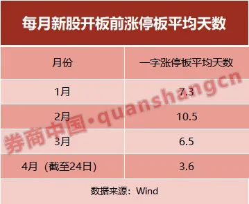 根据券商中国记者统计,新股上市后涨停板平均天数几乎逐月降低。1月5只新股涨停板天数平均7.3天;2月达到10.5天;3月降低至6.5天。截至24日,4月平均只有3.6天。