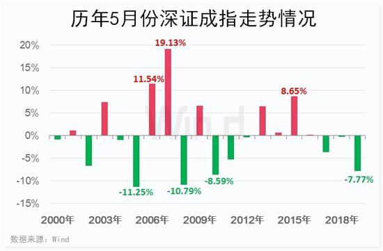 深证成指方面,Wind数据统计显示,过去20年,深证成指5月飘红次数共9次,其中2007年涨幅最大,达19.13%;同期飘绿次数11次,其中2005年跌幅最大,达-11.25%。2019年5月深证成指跌7.77%。
