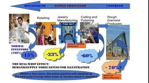 左边的是下游(零售端),右边的是上游(矿业公司)。终端减少15%的需求量,会带动零售公司减少33%左右的年采购量,由此引发的是中游(切磨工厂)-60%的原石采购,从而让矿业公司的产量-70%左右。图片来源:《Embrace the Diamond Industry‘s RiPPle Effect》