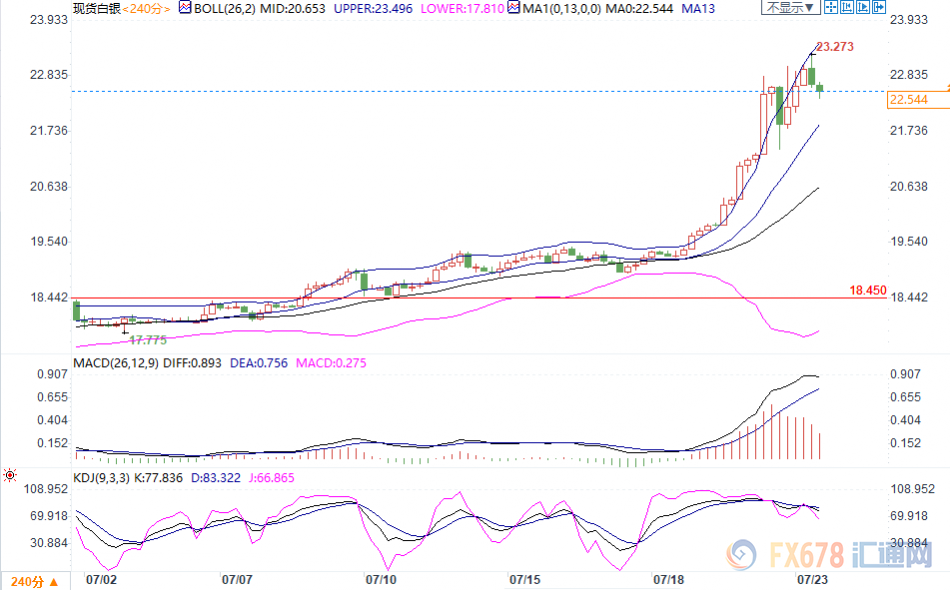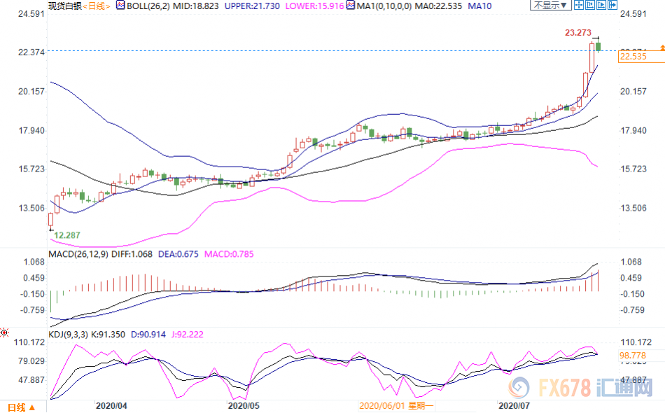 持续上涨;布林带开口,银价升破布林带上轨后涨势削减,盘中有所承压。MACD金叉、红柱能量增加,KDJ高位粘合、有转死叉趋势、指数接近90。银价盘中一度刷新2013年9月以来高点至23.27美元/盎司。之前白银飙升,引发部分空头止损,并吸引大量突破性买盘。技术面来看,后续仍有看涨空间,不过短线可能会因涨势过快而出现一波回调。