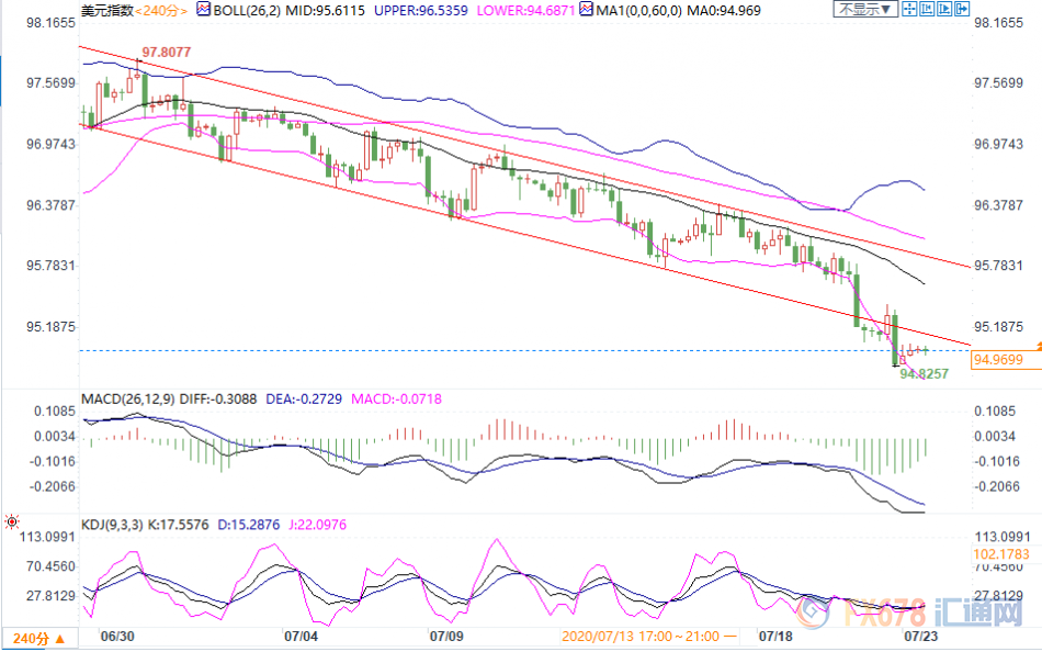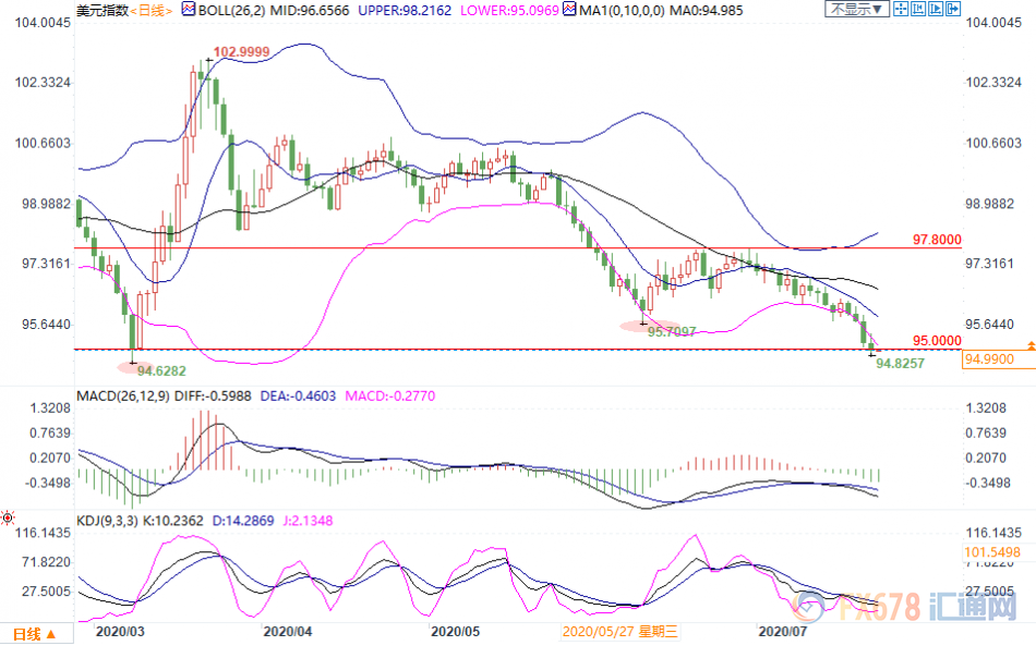 美元偏向低位震荡,若始终不能企稳95.00关口上方,可能进一步回踩94.63。