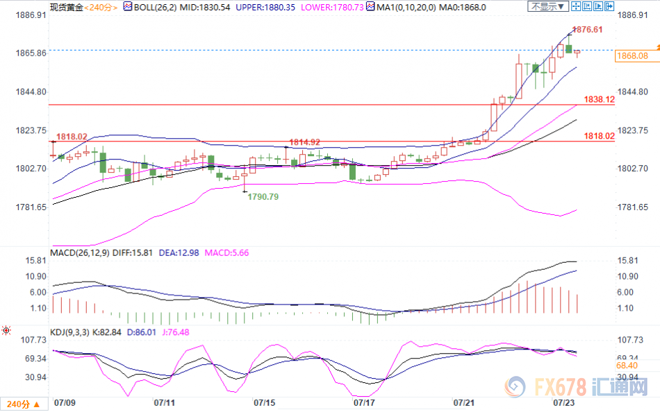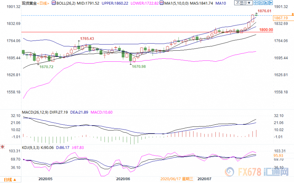震荡走高;布林带三轨向上,金价突破上轨,盘中最高触及1876.61美元/盎司,续刷近9年高位。MACD金叉、红柱能量增加,KDJ高位金叉、指数高于80。从技术面来看,金价仍偏乐观上行。