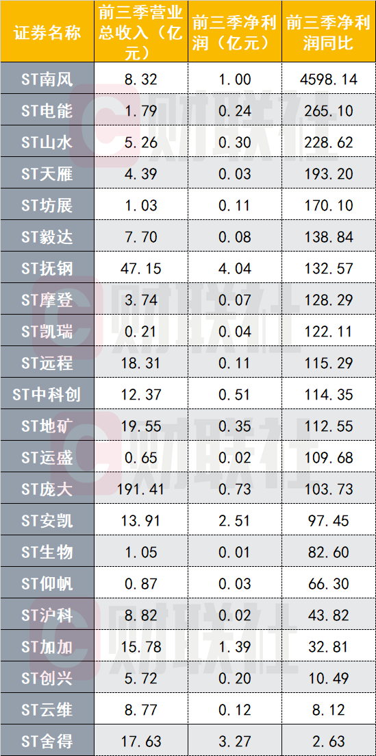 A股市场,目前还有哪些st股票有望实现业绩逆转,从而具备“摘帽”潜力?据最新三季报梳理,ST南风、ST电能、ST安凯等前三季净利润同比扭亏或者大增。ST中科创发布全年业绩预告,预计全年净利6800-7400万元,同比增长105.68%-106.18%。