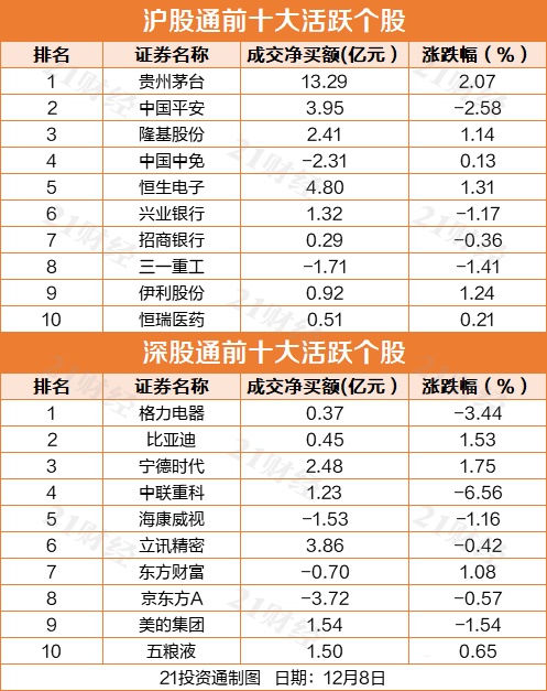 从个股来看,贵州茅台再获大幅净买入13.29亿,连续4日累计获净买入逾27亿元;其次今日恒生电子、中国平安分别获净买入4.80亿元和3.95亿元。京东方A、中国中免分别被净卖出3.72亿元、2.31亿元。